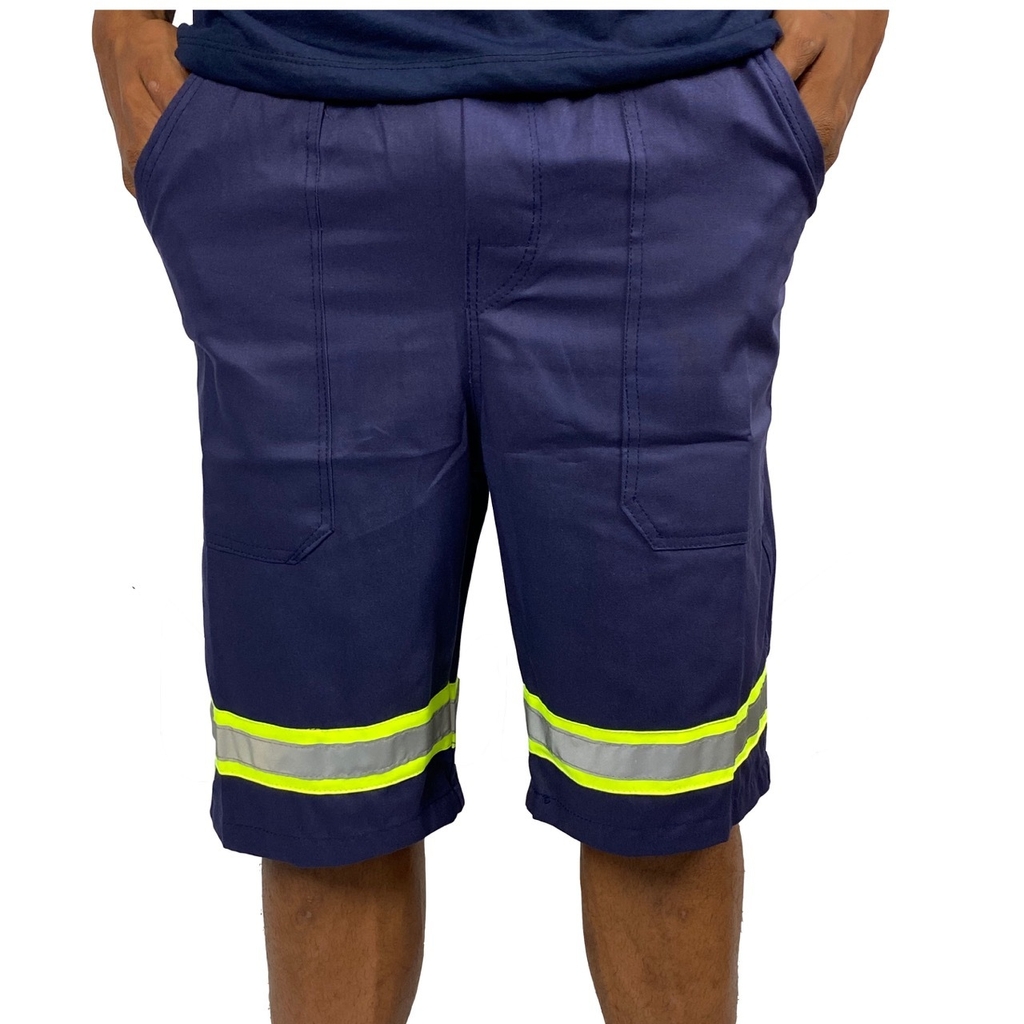 Bermuda toda Elástico com 4 bolsos Faixa Refletiva cordão na cintura na parte interna em brim 100% Algodão super REFORÇADA COSTURADO COM LINHA GROSSA indicada para profissionais que atuam em situações onde precisam ser vistos mesmo com baixa luminosidade, como Industria, Pedreiro, Eletricista, Soldador, Construção, Serralheiro, mecânico, estacionamentos, entregadores, motociclistas, trabalhadores ferroviários, motoristas entre outros