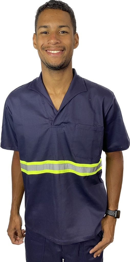 Jaleco gola italiana com faixa refletiva manga curta 1 bolso frente em brim 100% algodão recomendado para profissionais que atuam em situações onde precisam ser vistos mesmo com baixa luminosidade, como estacionamentos, entregadores, motociclistas, equipes de pesquisa de rua, trabalhadores ferroviários, pessoal de atendimento de emergência, transporte entre outras profissões.
